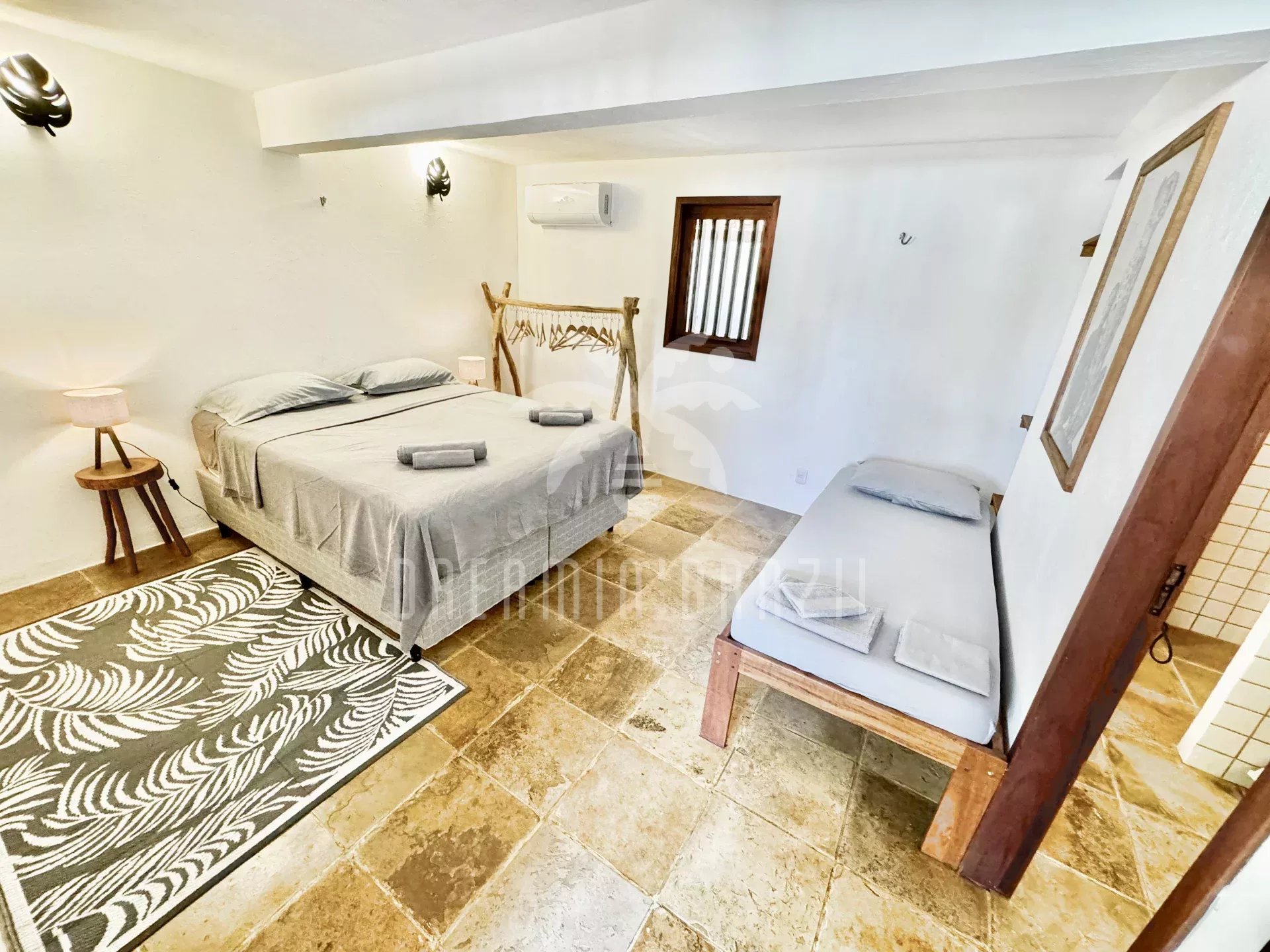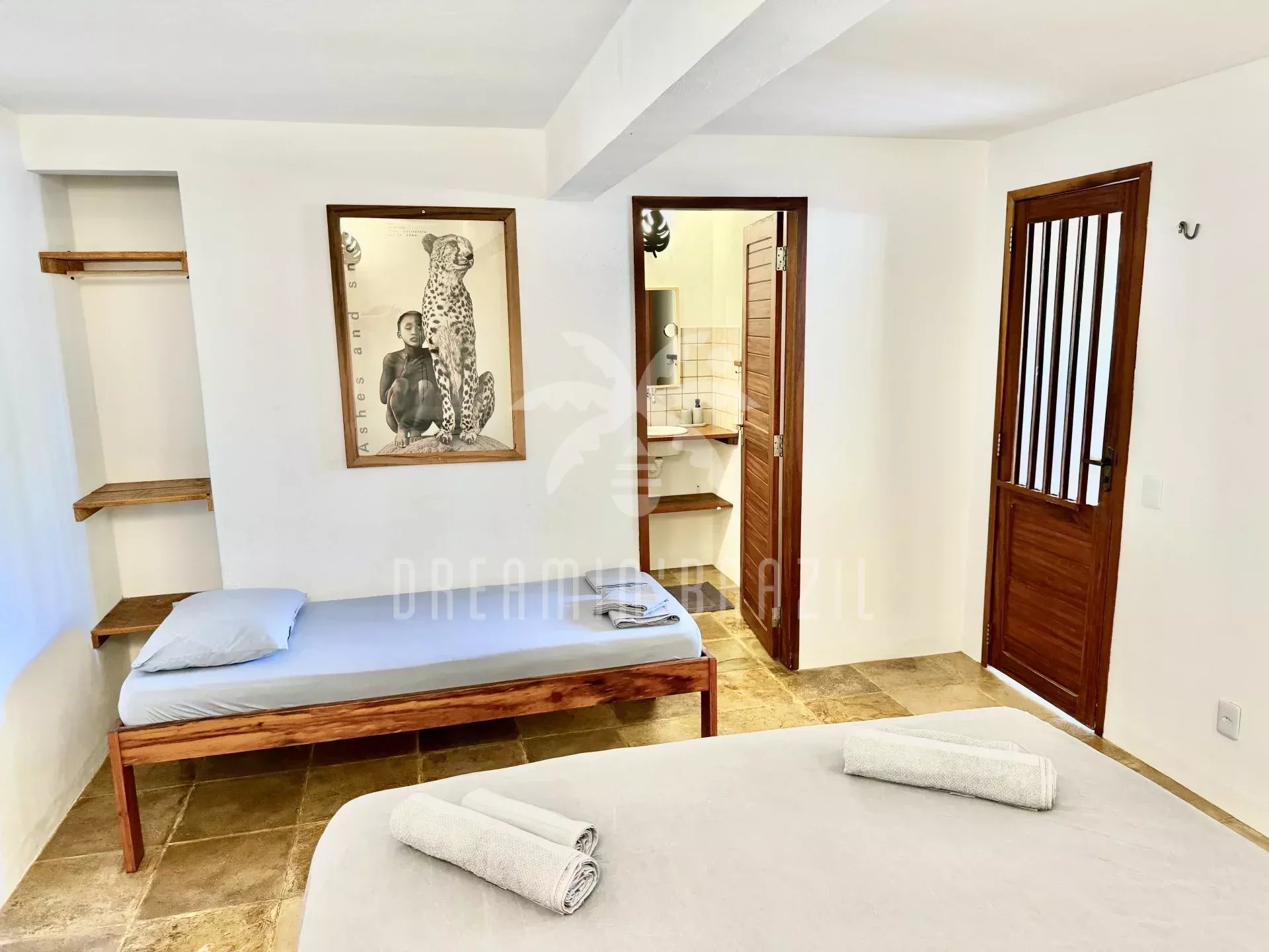 Spacious bedroom with double bed (160x200) and single bed, en-suite bathroom with WC